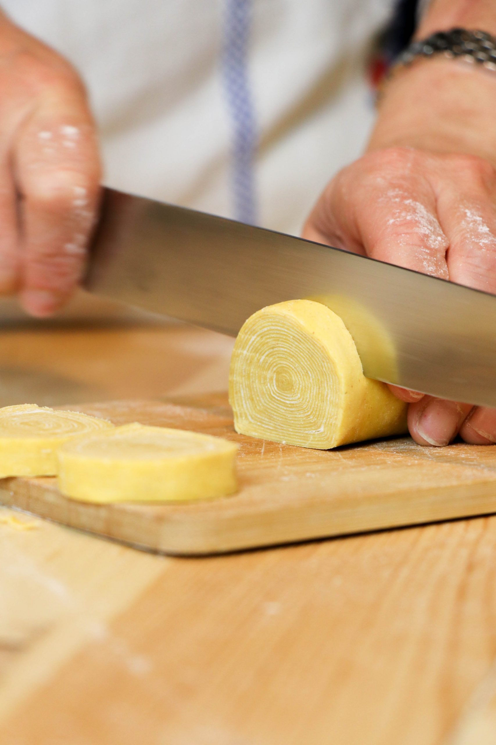 - Ottenuta una striscia lunga di impasto, infarinala e inizia ad avvolgerla su se stessa