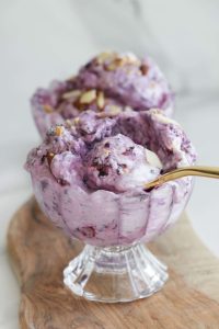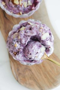 Esistono tante versioni di questo gelato proteico ai fiocchi di latte, la mia è con mirtilli, biscotti sbriciolati e mandorle a scaglie, molto goloso, ma al tempo stesso salutare. Al posto dei mirtilli si possono usare le fragole, le banane o i lamponi, a voi la scelta. Si possono fare anche altri abbinamenti, come la banana con il burro di arachidi e il cioccolato, o solo con scaglie di cioccolato fondente, l’importante è che vada incontro ai vostri gusti.