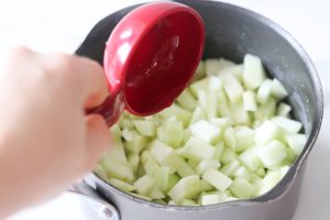Prendi le tue mele, lavale, togli la buccia e tagliale a pezzetti; mettile in un pentolino.