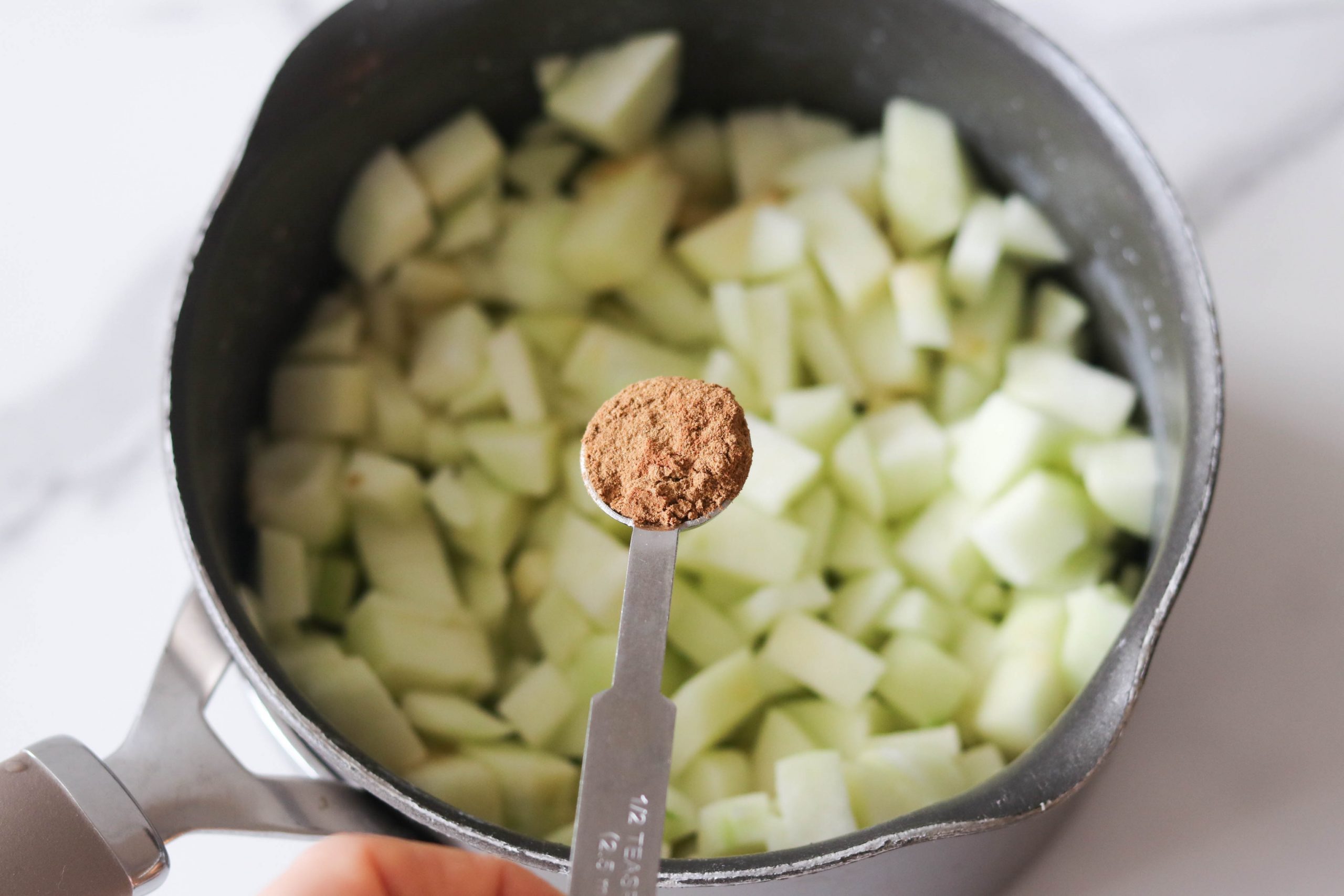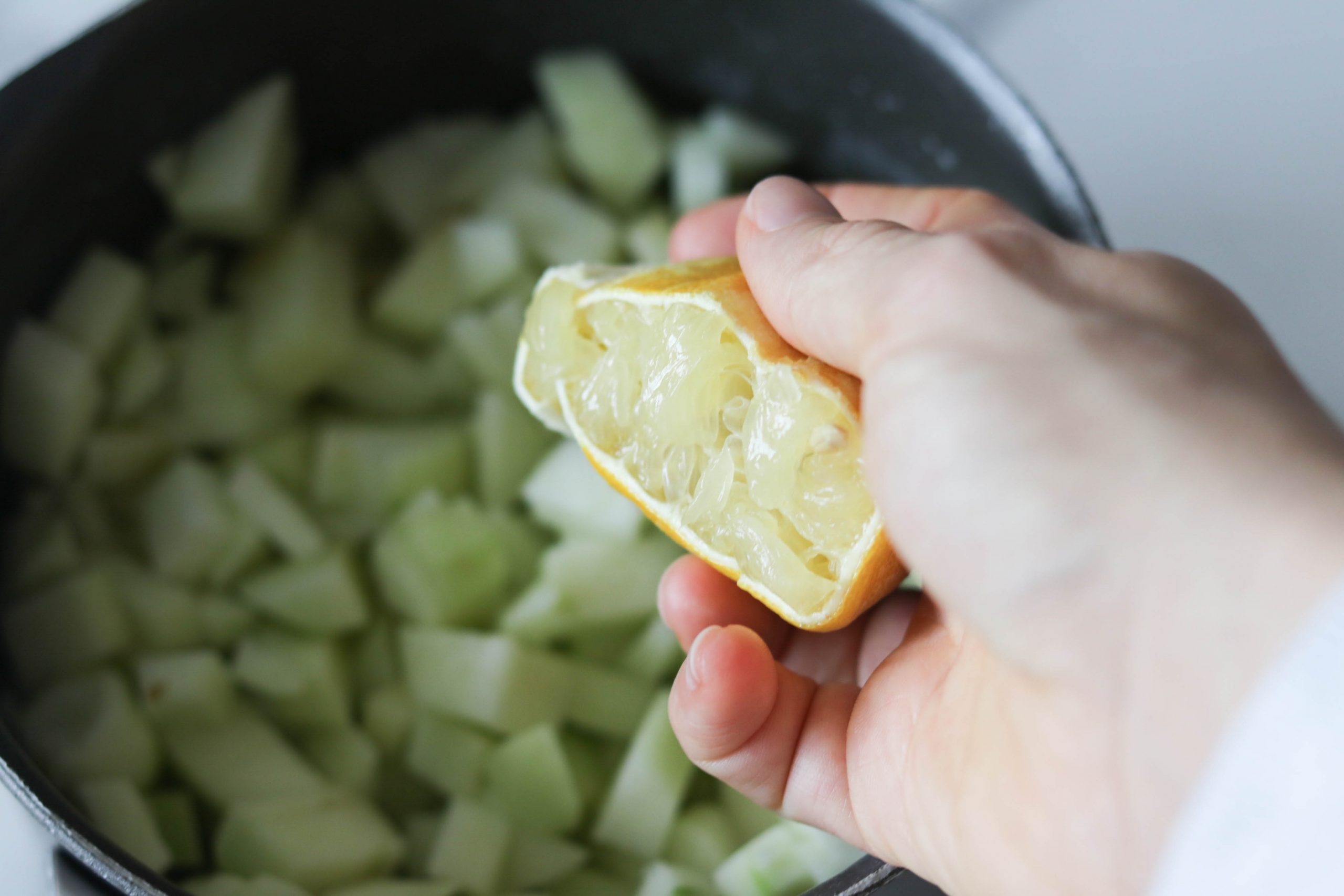 Aggiungi mezzo limone spremuto, 90ml d’acqua e mezzo cucchiaino di cannella in polvere.