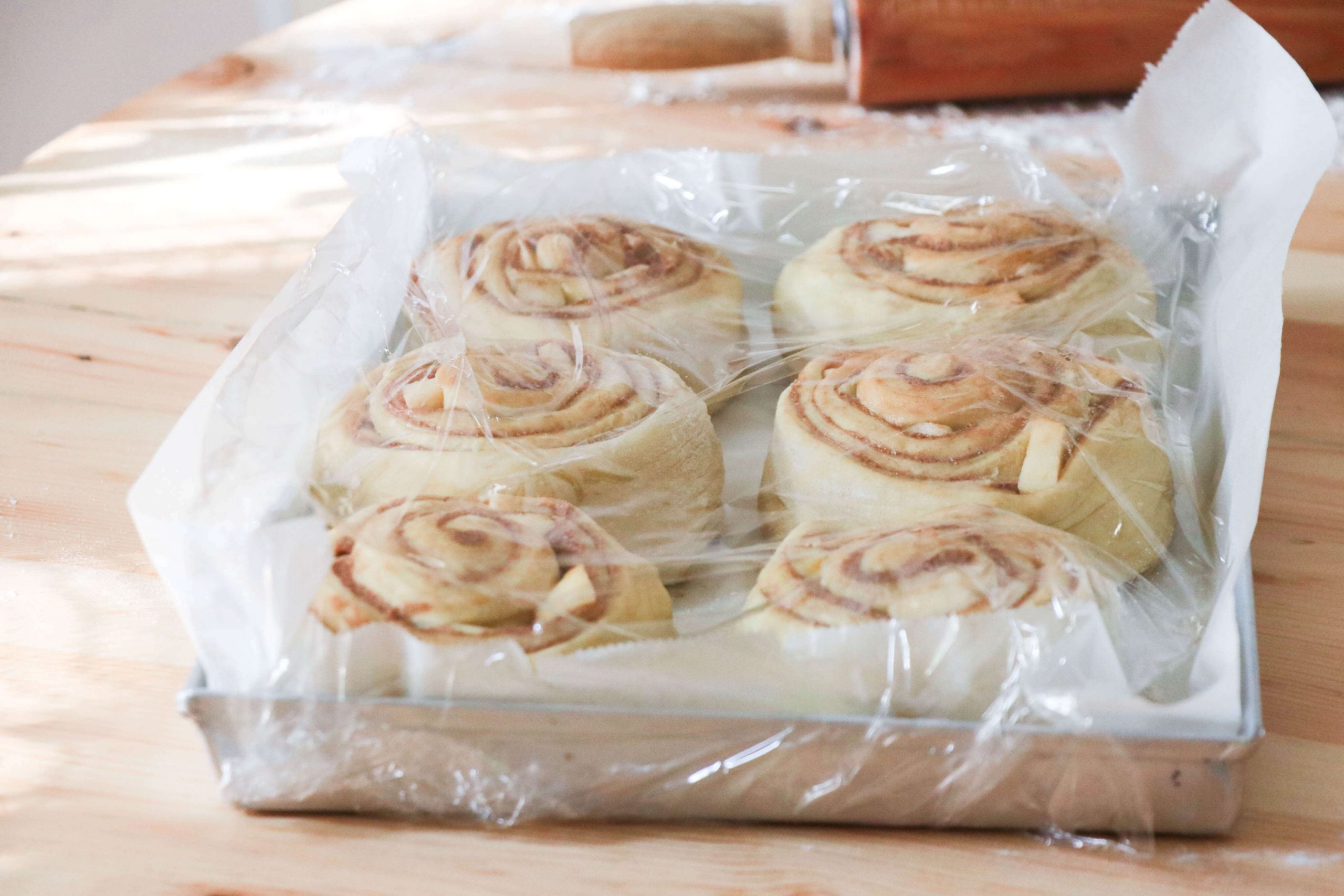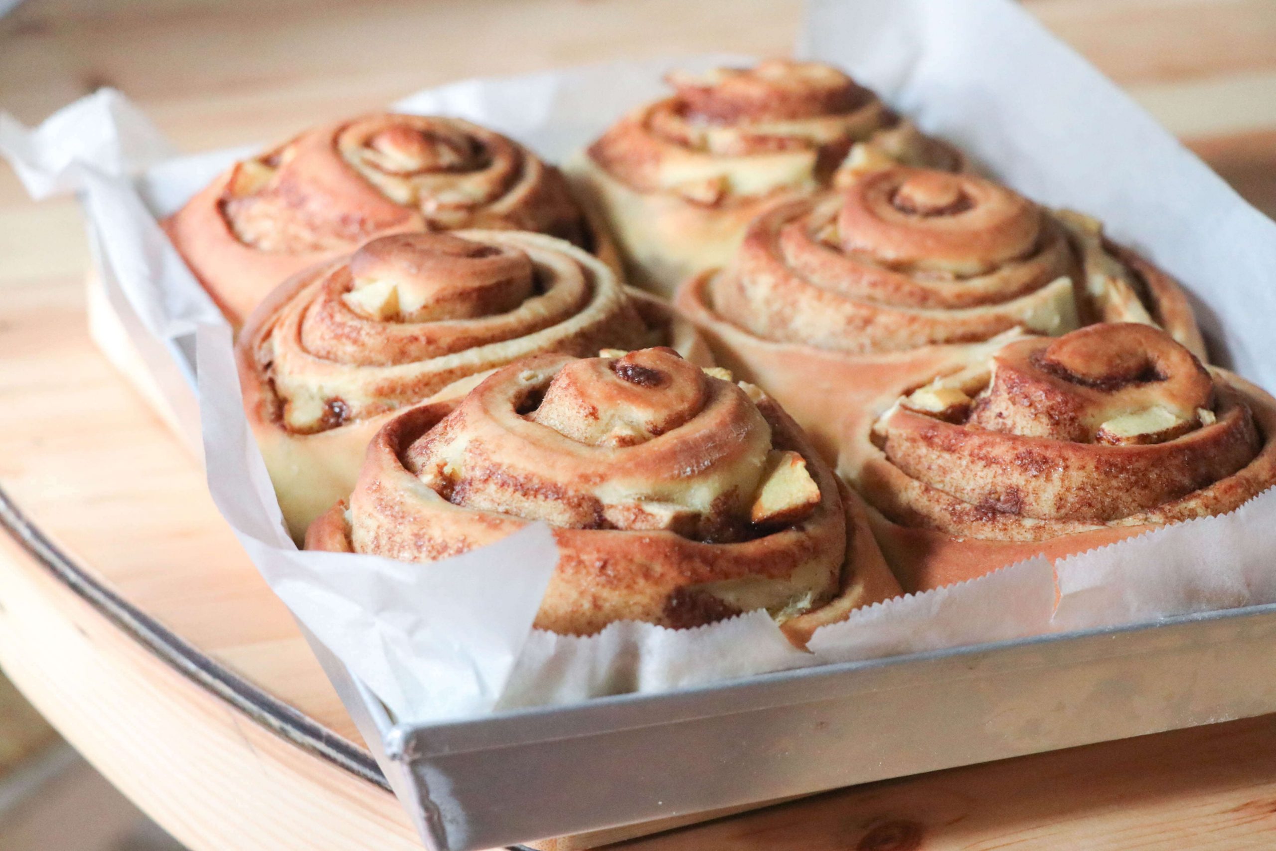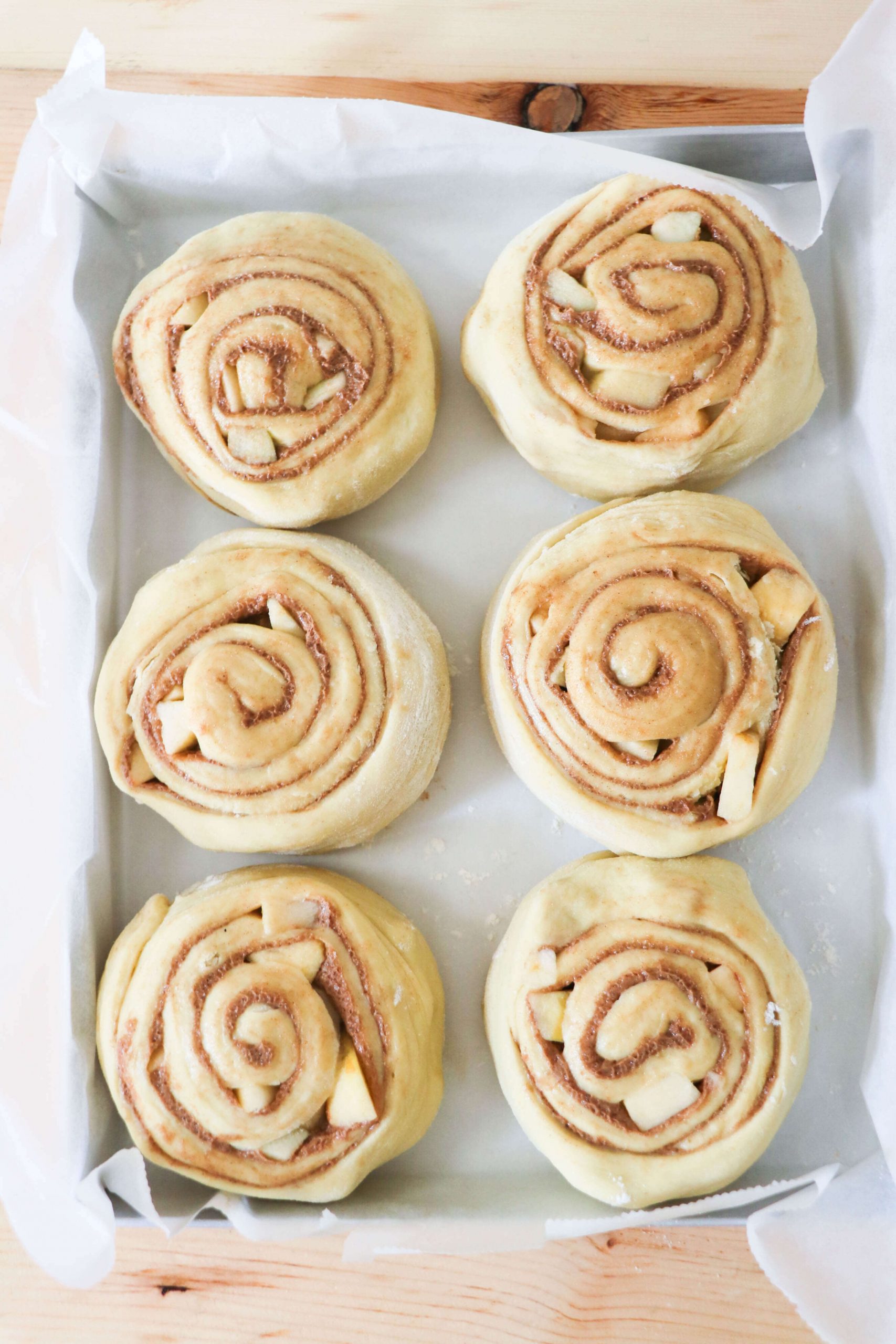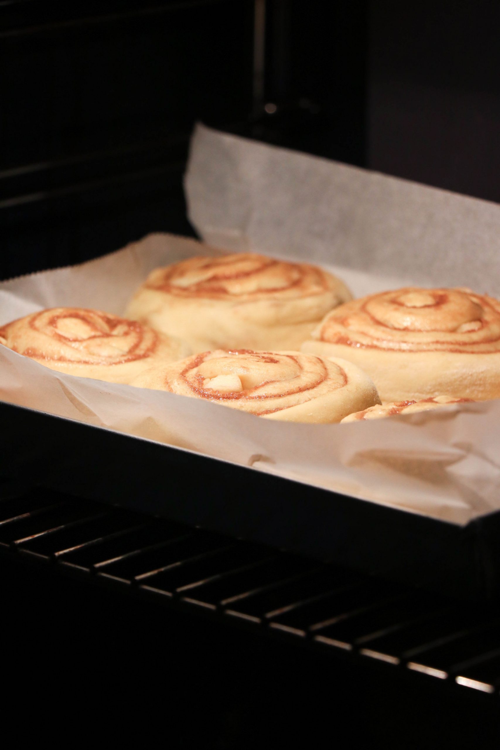 • Riponi poi tutti i tuoi Cinnamon Rolls sulla teglia rettangolare 30x20cm, riverstita di carta forno
