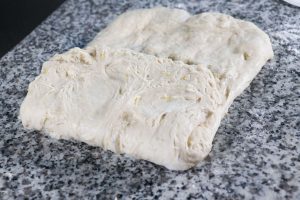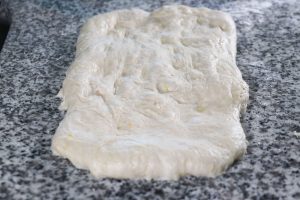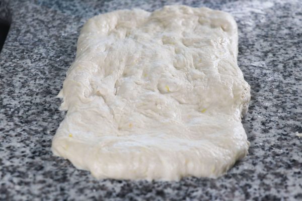 - Il giorno dopo o qualche ora dopo, cospargi di farina il piano, con il mattarello stendi l'impasto formando un rettangolo non molto spesso, di circa 2cm. Il rettangolo davanti a te dovrà avere i lati a destra e sinistra corti e quelli in basso e in alto più lunghi