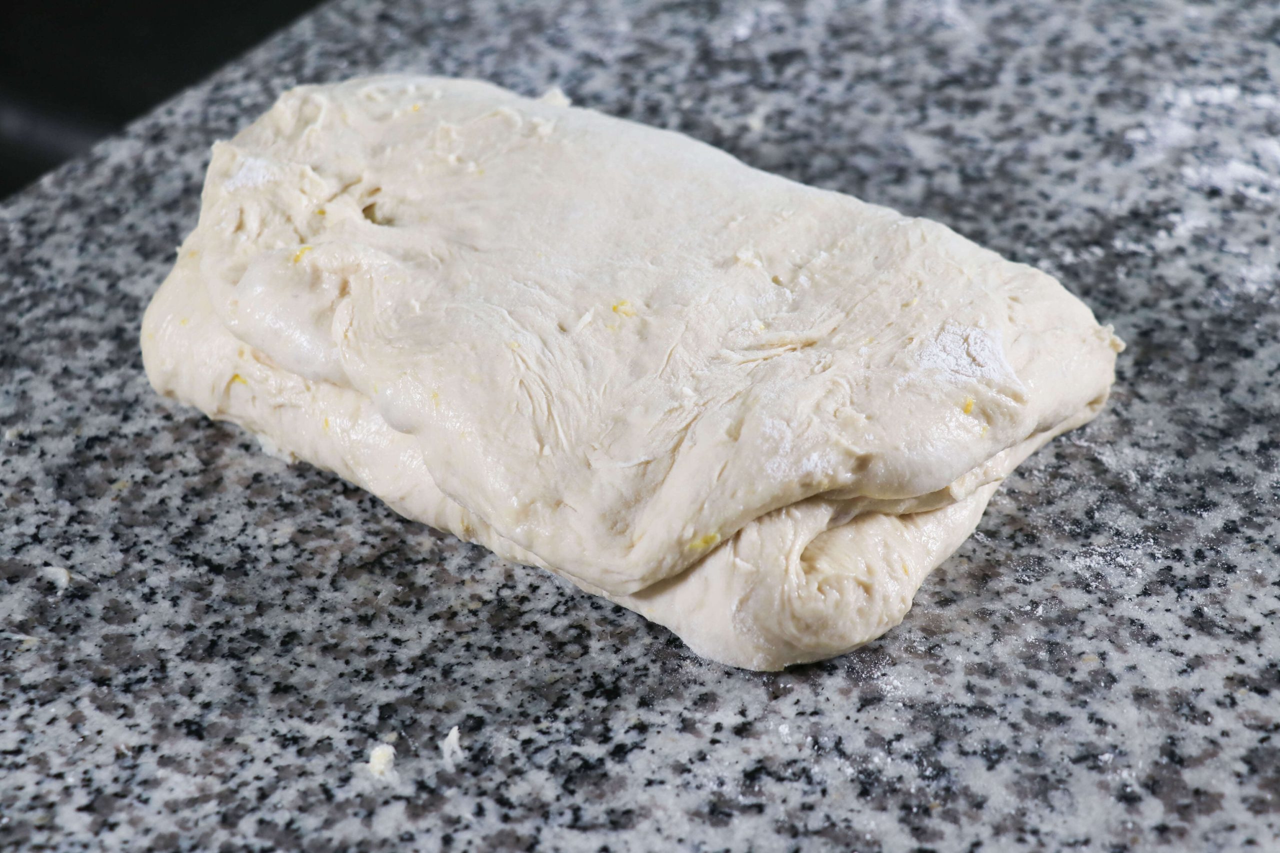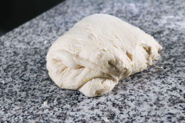 Trasferisci l’impasto su un piano pulito e dai forza all’impasto facendo le pieghe a tre: con le mani allunga l’impasto formando un rettangolo, trasporta un lato al centro, poi l’altro e infine chiudi portando il lato corto a unirsi con l’altro; forma un panetto e lascia riposare in un contenitore ben sigillato per 2 ore.