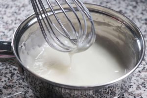 La prima cosa da fare è il milk roux, quindi prendi un pentolino e metti la farina, il latte e l’acqua. Mescola di tanto in tanto fino a ottenere un composto gelatinoso. Togli dal fuoco e lascia raffreddare completamente.