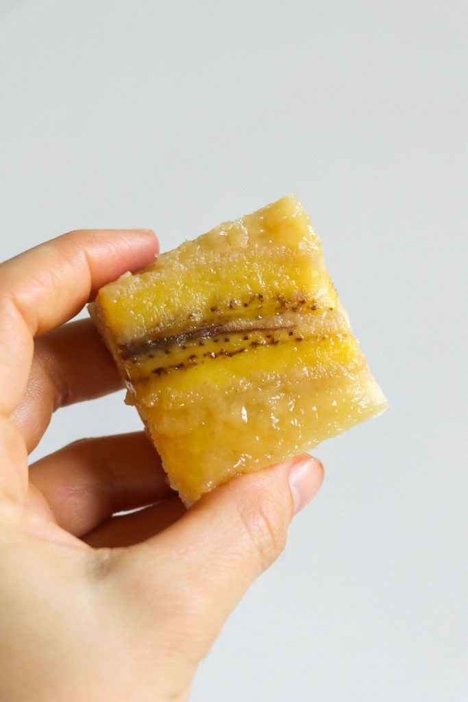 - Taglia le due banane a metà e ponile su una teglia per dolci quadrata 23x23 ricoperta da carta forno; versa sopra la miscela di burro e zucchero